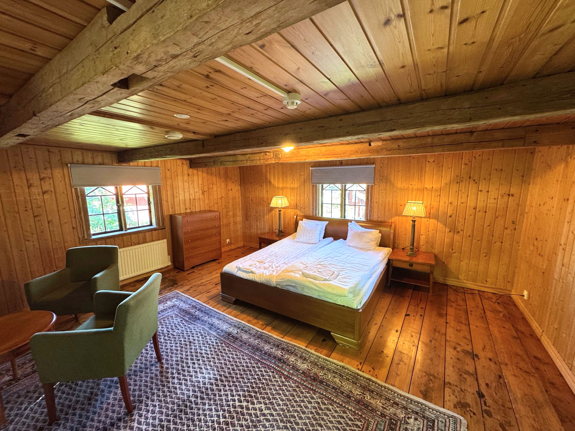 • 1 gårdshus som är en separat stuga. Gårdshuset delar dusch och badrumsutrymme i huvudbyggnaden. Inget handfat på rummet.